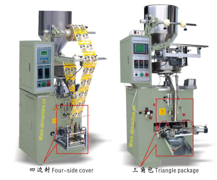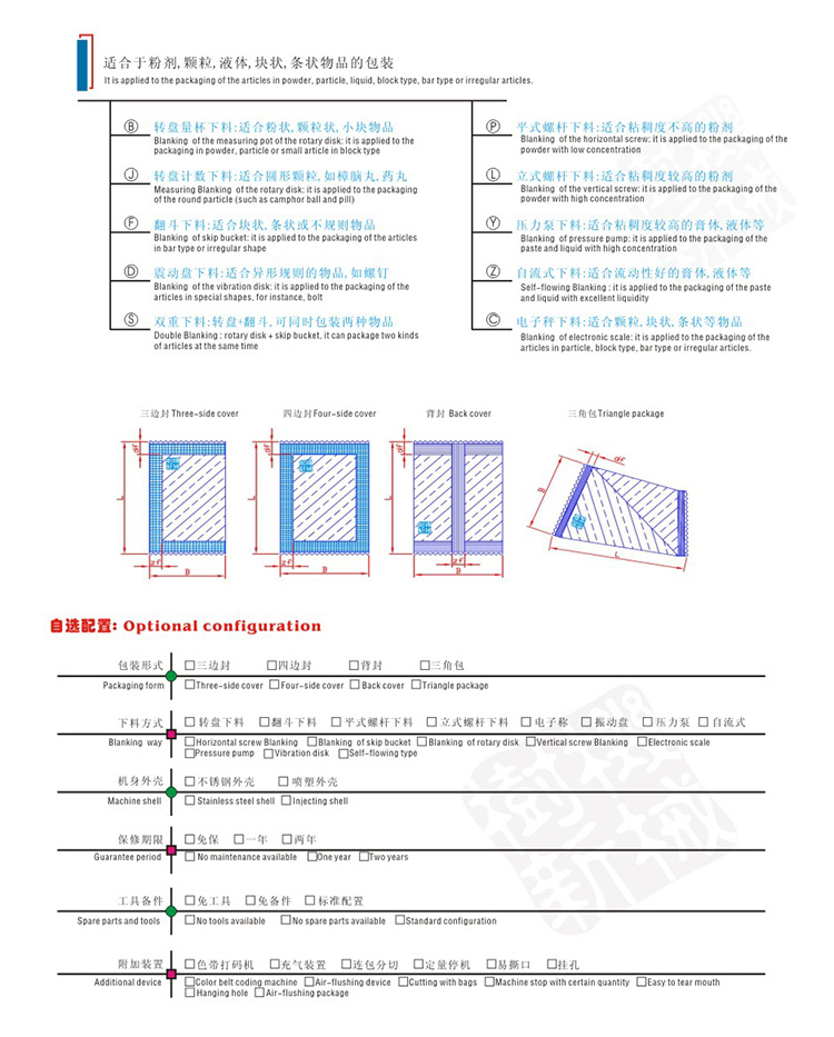 - 順應工具:粉劑,顆粒,塊狀,條狀,不法則物品,如:膨化食物,糖果,谷物,豆類,奶粉,調味品,麥片,茶葉,小玩具,螺絲,樟腦丸,枯燥劑.多種包裝的情勢,多種下料體例自在組合,合適百般百般的包裝物品.主動實現制袋,充填,封口,堵截,充氣,打碼,限量停機,定包分切等一系列舉措.